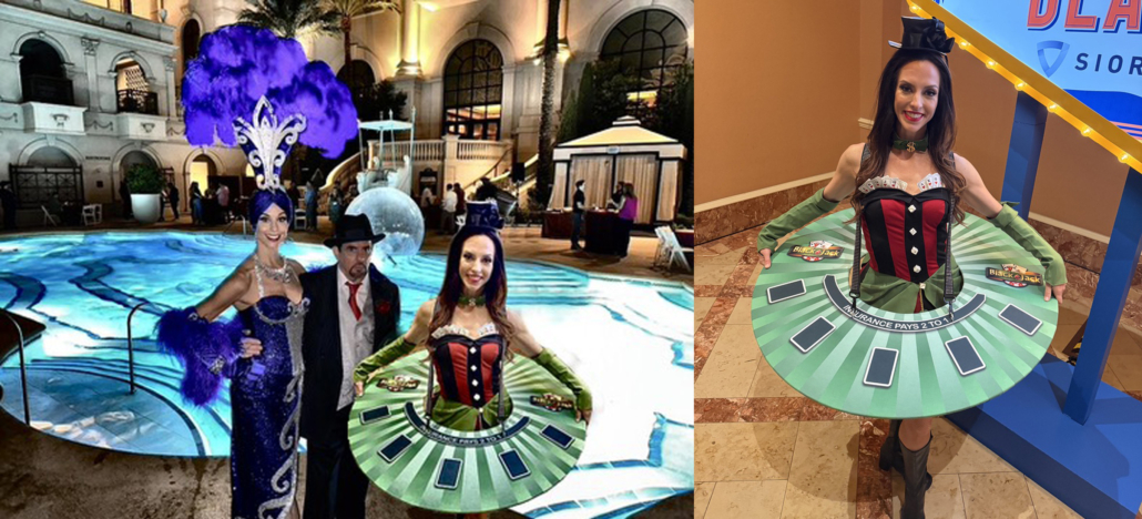 Take your event entertainment to the next level with our one-of-a-kind Suspended Blackjack Table! This interactive “Living Table” is elegantly worn around the waist of a professional, costumed dealer who strolls throughout your event inviting guests to play. Perfect for receptions, networking hours, and venues with limited space, this dynamic feature brings the game directly to your guests — no setup or casino floor required.